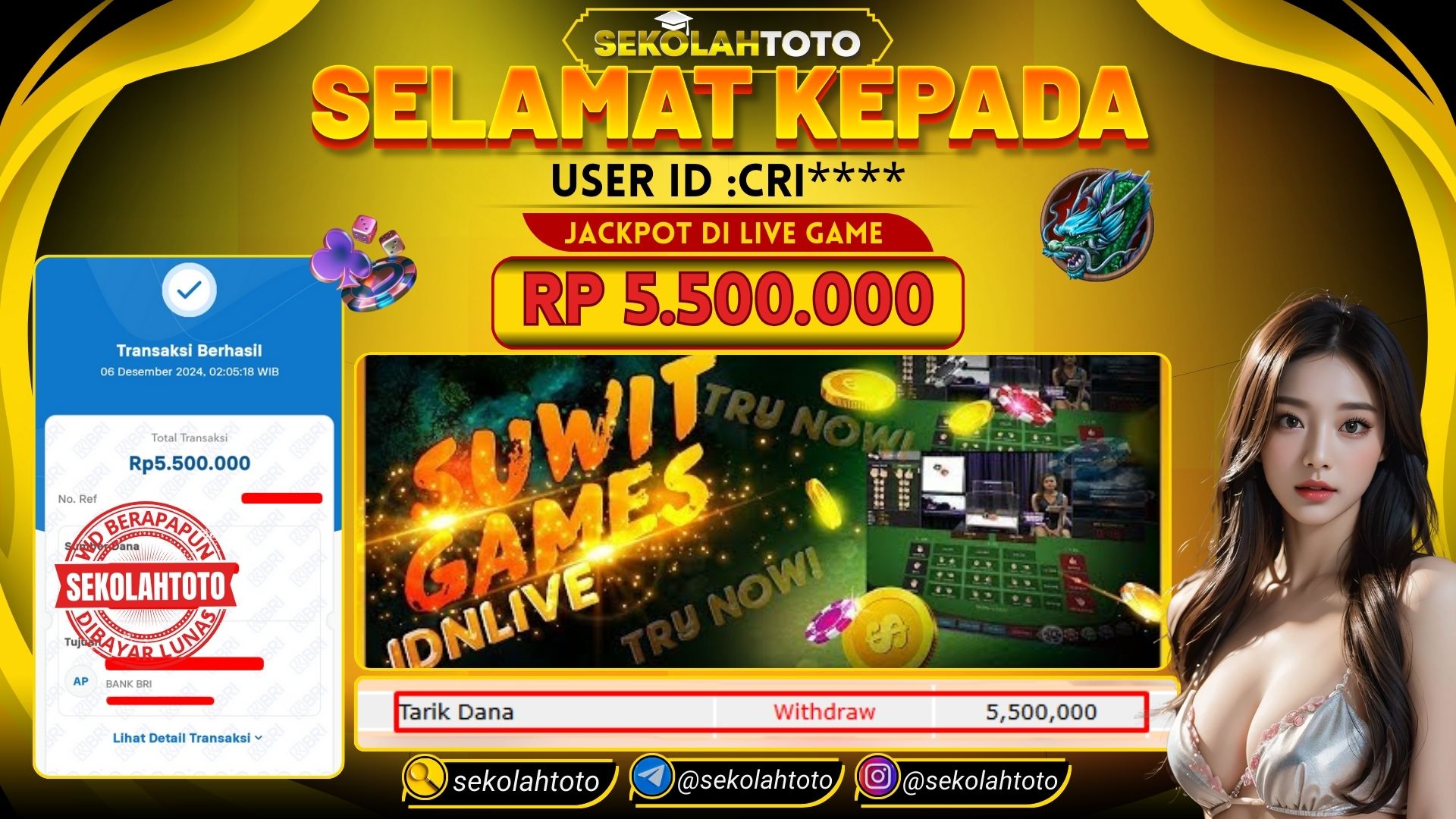 BUKTI PEMBAYARAN JACKPOT LIVE GAME 6 Desember 2024 Posted by kepsektoto SUWIT GAMES IDNLIVE JUMAT , 06 DESEMBER 2024 RP. 5,500,000,- Selamat Kepada Pemenang. Salam JP, Sekolahtoto ! Updated: 6 Desember 2024 at 23:10 ◀ Prediksi Togel Toto Macau Hari Ini BUKTI PEMBAYARAN JACKPOT PGSOFT ▶