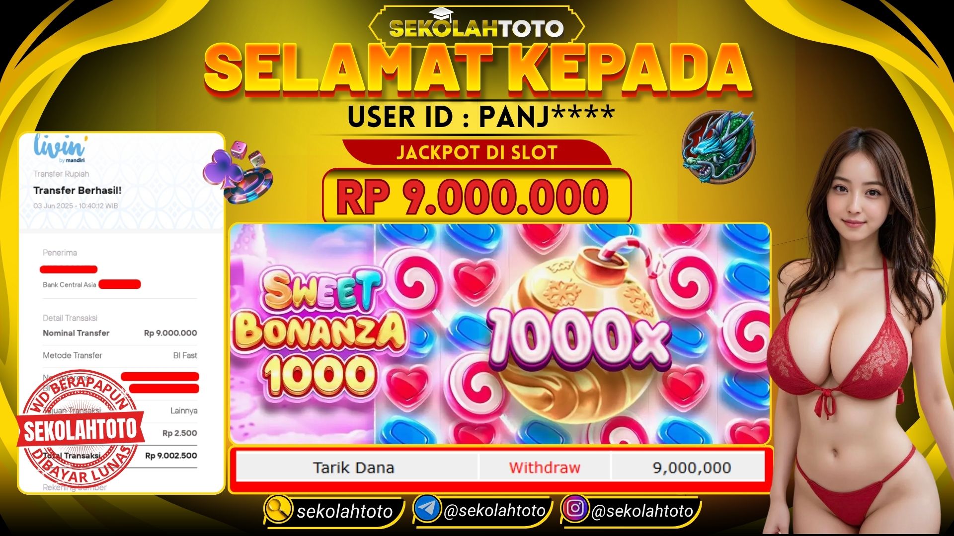 BUKTI PEMBAYARAN JACKPOT PRAGMATIC 3 Juni 2025 Posted by kepsektoto Sweet Bonanza 1000 SELASA, 3 JUNI 2025 RP 9,000,000,- Selamat Kepada Pemenang. Salam JP Updated: 3 Juni 2025 at 11:05 ◀ BUKTI PEMBAYARAN JACKPOT PRAGMATIC PLAY Prediksi Togel Bullseye Pools Hari Ini ▶