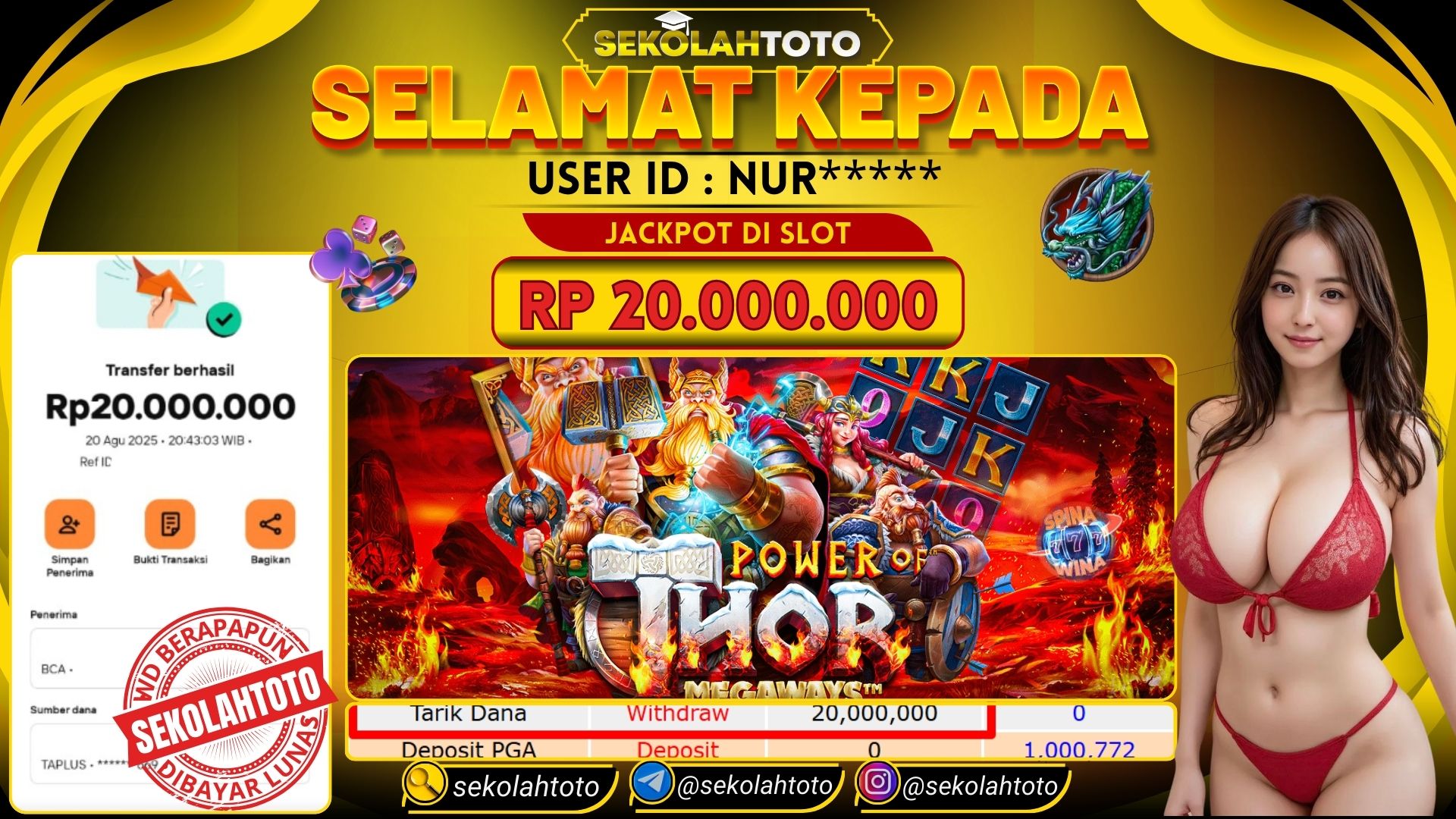 BUKTI PEMBAYARAN JACKPOT PRAGMATIC PLAY 20 Agustus 2025 Posted by kepsektoto Power Of Thor Megaways RABU, 20 AGUSTUS 2025 RP 20,000,000,- Selamat Kepada Pemenang. Salam JP Updated: 20 Agustus 2025 at 20:52 ◀ BUKTI PEMBAYARAN JACKPOT PG SOFT Prediksi Togel Bullseye Pools Hari Ini ▶