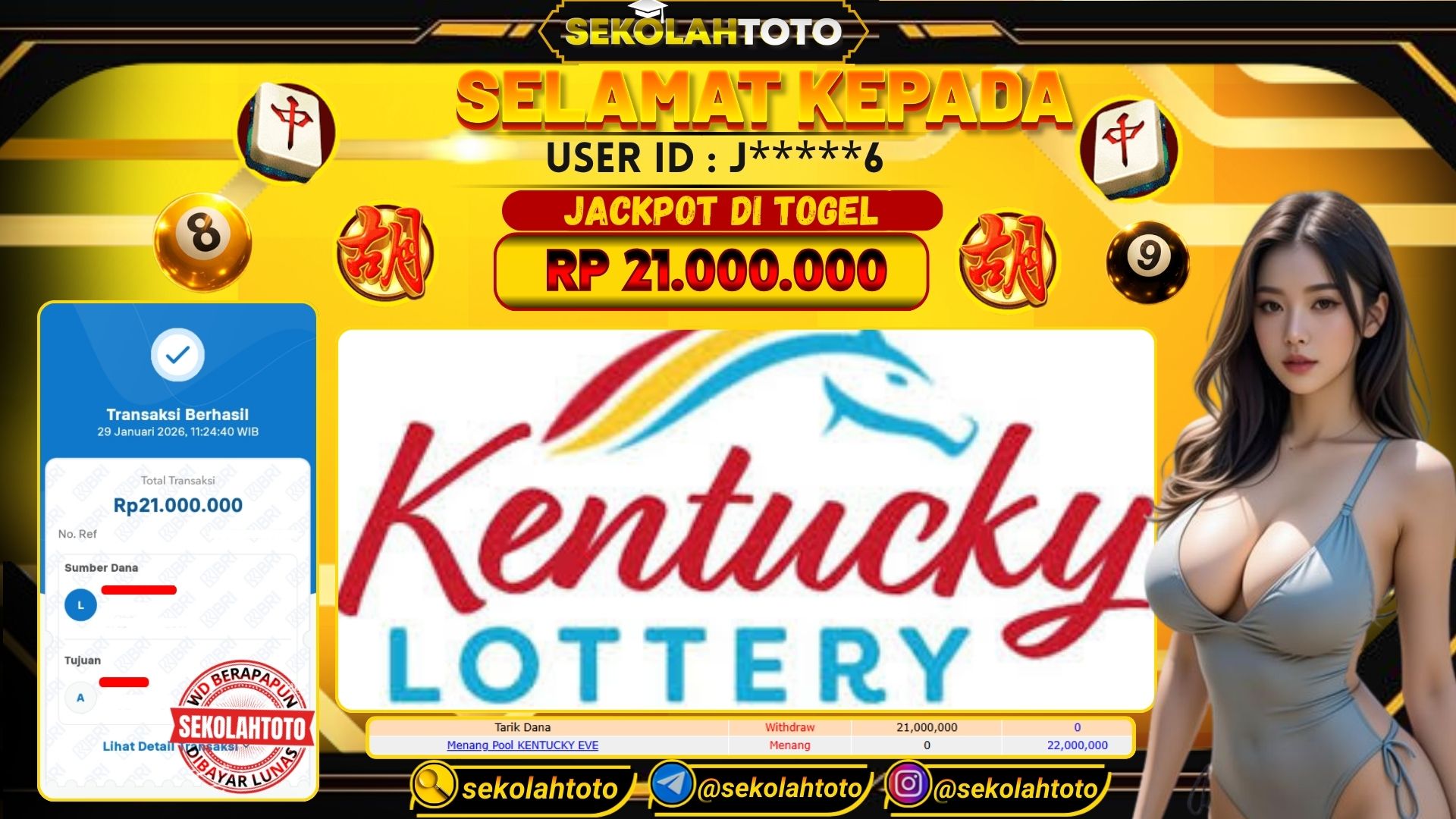 BUKTI PEMBAYARAN JACKPOT TOGEL 29 Januari 2026 Posted by kepsektoto KENTUCKY EVENING KAMIS, 29 JANUARI 2026 RP 21,000,000,- Selamat Kepada Pemenang. Salam JP Updated: 30 Januari 2026 at 01:45 ◀ BUKTI PEMBAYARAN JACKPOT PG SOFT Prediksi Togel PCSO Hari Ini ▶