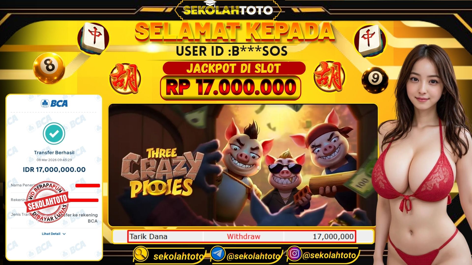 BUKTI PEMBAYARAN JACKPOT PG SOFT 8 Maret 2026 Posted by Admin Sekolahtoto THREE CRAZY PIGGIES MINGGU, 8 MARET 2026 RP 17,000,000,- Selamat Kepada Pemenang. Salam JP Updated: 8 Maret 2026 at 10:50 ◀ BUKTI PEMBAYARAN JACKPOT PRAGMATIC PLAY BUKTI PEMBAYARAN JACKPOT PRAGMATIC PLAY ▶