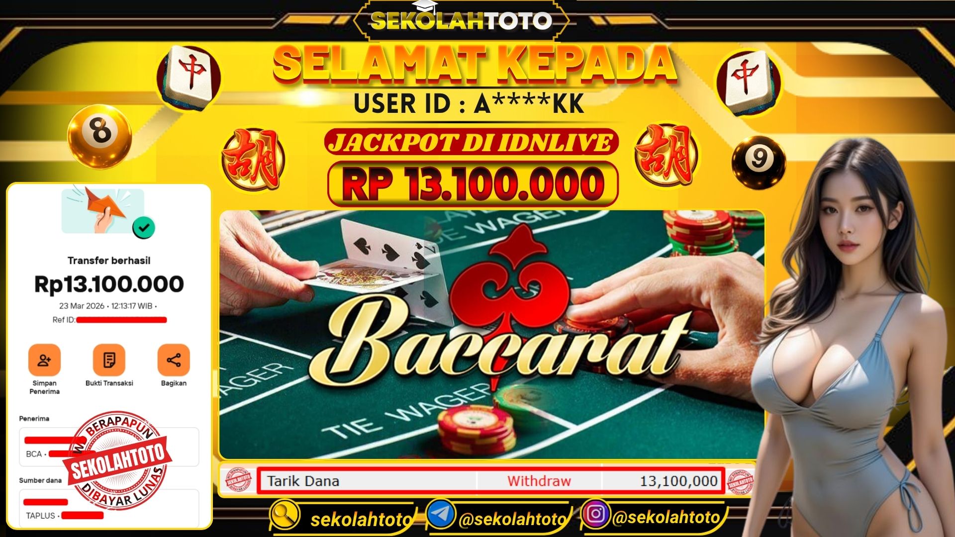 BUKTI PEMBAYARAN JACKPOT LIVE CASINO 23 Maret 2026 Posted by Admin Sekolahtoto BACCARAT SENIN, 23 MARET 2026 RP 13,100,000,- Selamat Kepada Pemenang. Salam JP Updated: 23 Maret 2026 at 13:45 ◀ Prediksi Togel Toto Macau Hari Ini BUKTI PEMBAYARAN JACKPOT TOGEL ▶